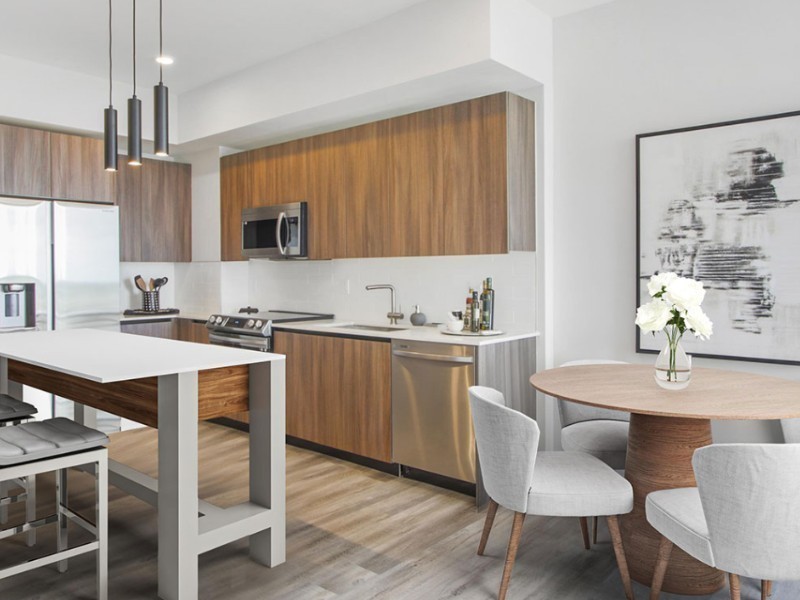 Estudios completamente amueblados, residencias de 1 dormitorio, 2 dormitorios y walkups. Cocinas gourmet con gabinetes a medida Electrodomésticos de acero inoxidable, incluidos refrigerador/congelador y lavavajillas, estufa y microondas
